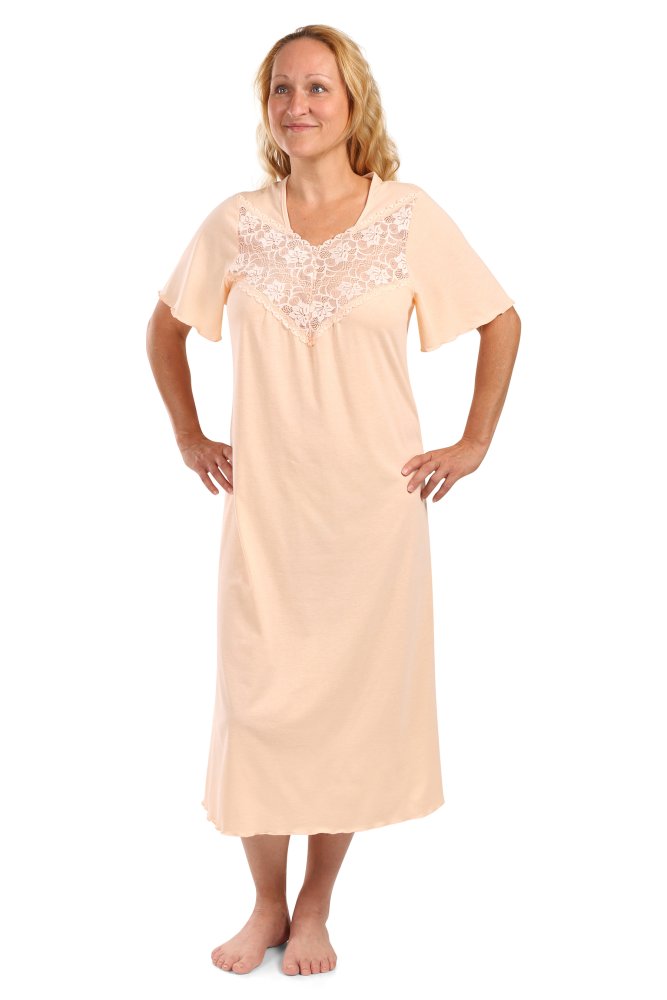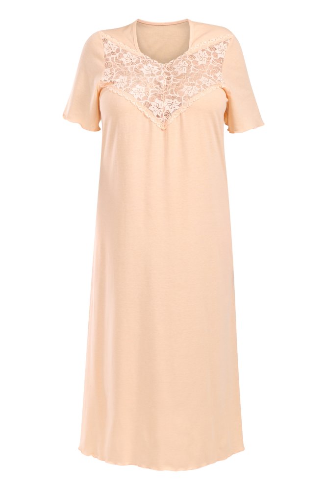 Noční košile pro dámy Svatava je elegantní i pohodlná zároveň, je ušitá v Česku a její nošení zaručuje příjemný pocit. Látka této noční košile kombinuje polyester a bavlnu. Košilka je delšího střihu, má krátké, rozšířené rukávy a ve výstřihu je zdobena krajkou, která košilce dává elegantní nádech.